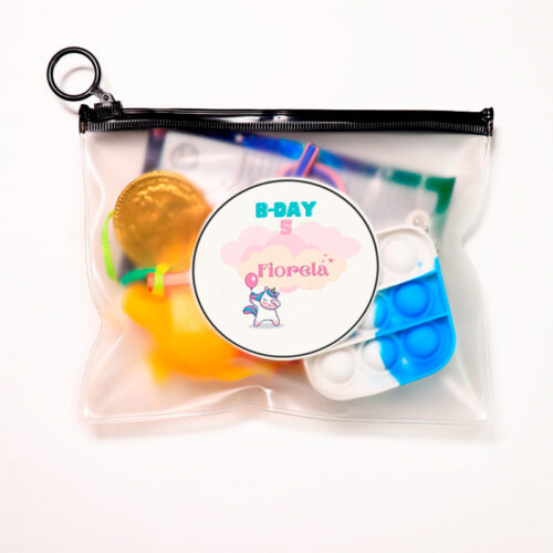 Rated 0 out of 5$1.41Esta puede ser otra opción novedosa para la presentación de bolsa de regalitos de la fiesta de tu hija. Es una bolsa de PVC nevado con un zíper negro con gancho oversize. Elige entre la variedad de textos a aplicarle, puedes rellenarla con los recuerdos de Party People que escojas.Lista de deseos -
