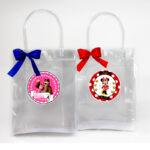 Esta es una bolsa ideal para darle estilo y clase a la bolsista de regalos del cumpleaños de tu hija. Es de PVC transparente, mide 8 x 6 pulgadas. Viene con un sticker redondo 3 pulgadas con el personaje favorito y personalización del evento, también lleva un pequeño detalle de una chonga de listón de tela. ¡Todos hablaran de ellas!