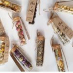 Cada tubo es de vidrio con tapón de corcho, con una etiqueta personalizada.
